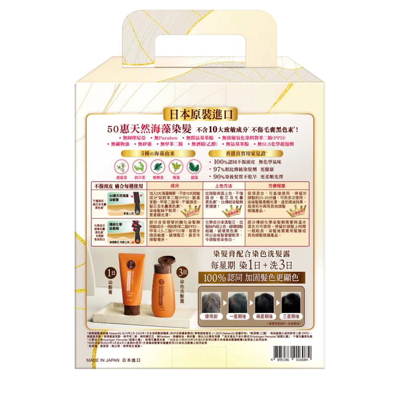 Shampoo: Dye, clean and nourish hair at the same time. Suitable for daily usage for better coloring effect. Contains natural seaweed extract and premium plant oil, which can nourish hair. Dye, clean and nourish hair at the same time.