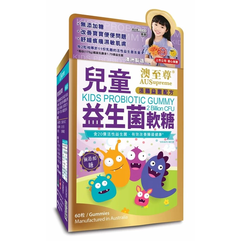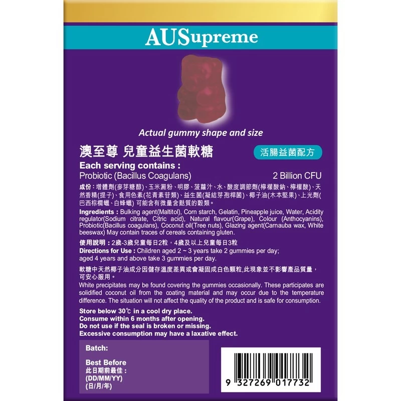 AUSupreme Kids Probiotic Gummy contains 2 billion CFU probiotics (Bacillus coagulans) per serving. It helps to make sure that your children’s intestinal tract stays healthy by maintaining a balanced level of good bacteria in the intestines, and play a vital role in supporting a healthy digestive system and good immunity.