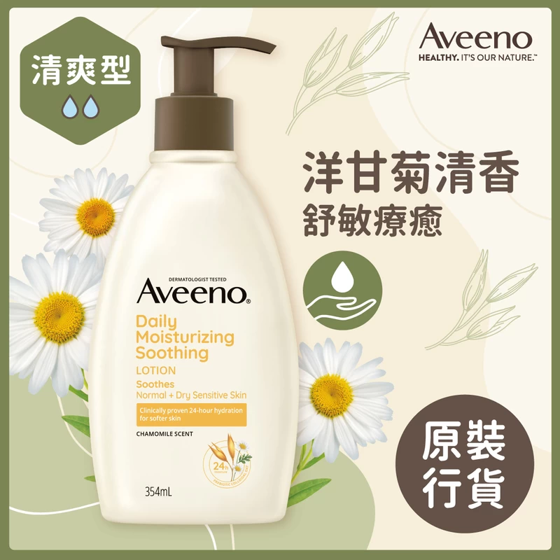 Aveeno Daily Moisturizing Soothing Lotion contains natural active ingredient, colloidal oatmeal and chamomile scent to deeply moisturize your skin for 24 hours and soothe your senses