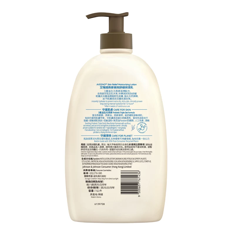 Aveeno Skin Relief Moisturizing Lotion combines Triple Oat Complex and shea butter extract to replenish skin with necessary water and oils. It is clinically proven to relieve itchy, extra-dry skin and moisturize for a 72 hours. This rich, yet fast-absorbing lotion can soothe and protect chapped and cracked skin. This naturally nourishing formula contains no added fragrance and is gentle enough for sensitive skin, which is highly recommended by dermatologists. Aveeno Skin Relief Moisturizing Lotion leaves your skin soft and smooth with a naturally healthy looking.