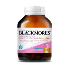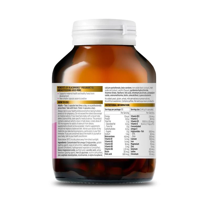 Blackmores Pregnancy & BreastFeeding Gold provides an ideal daily dose of 20 important nutrients for mother and baby including 12 vitamins (Vit B1, B2, B3, B5, B6, B12, Folic acid, Vit C, E, D, Biotin, Betacarotene), 7 minerals (Iron, Zinc, Selenium, Chromium, Iodine, Calcium, Magnesium) and 500 mg Omega3 fatty acids per serving.