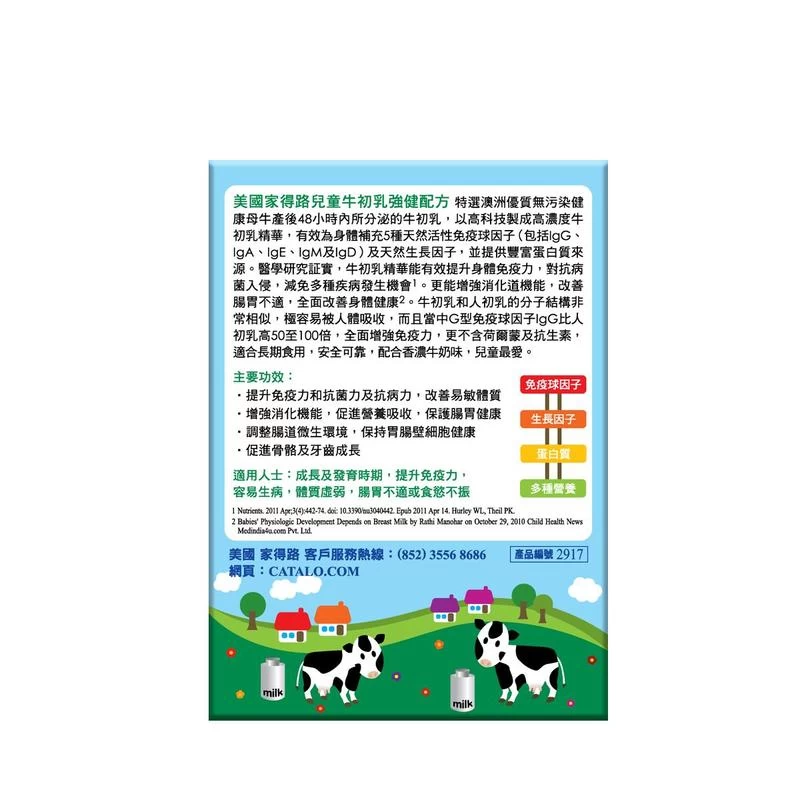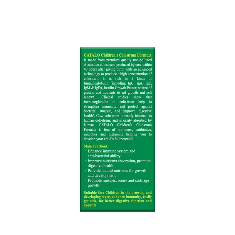 CATALO Children’s Colostrum Formula is made from premium quality non-polluted Australian colostrum, produced by cow within 48 hours after giving birth, with an advanced low-temperature technology to produce a high concentration of colostrum. It is rich in 5 kinds of Immunoglobulin (including IgG, IgA, IgE, IgM & IgD), Insulin Growth Factor, source of protein and nutrients to aid growth and cell renewal. Clinically studies show that immunoglobulin in colostrum help to strengthen immunity and protect against viral and bacterial attacks, and improve digestive health. Cow colostrum is nearly identical to human colostrum, and is easily absorbed by human. CATALO Children’s Colostrum Formula is free of hormones, antibiotics, microbes and melamine helping you to develop your child’s full potential!