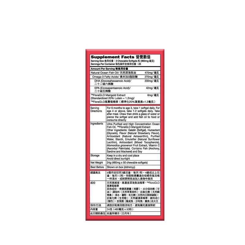 Made from unpolluted small ocean fishes by special technology to preserve the oil integrity and provide ultra-purified ocean fish oil with no added sugar. A serving provides 200mg DHA and 42mg EPA, with its high proportion of DHA in the ratio of about DHA 5:1 EPA is specially formulated for promoting the brain and eye development, learning ability including concentration, memory power and problem solving skills for children. It also contains patented ingredient ™FloraGLO Marigold Extract to provide standardized 20% lutein which protects eyes against damages caused by harmful blue light from digital screens and thereby supporting macular and overall eye health. CATALO Children’s DHA IQ Formula (Lutein Added) is specially encapsulated in a unique chewable softgel with natural strawberry flavor, it tastes great and is easy to chew. Children simply love it!