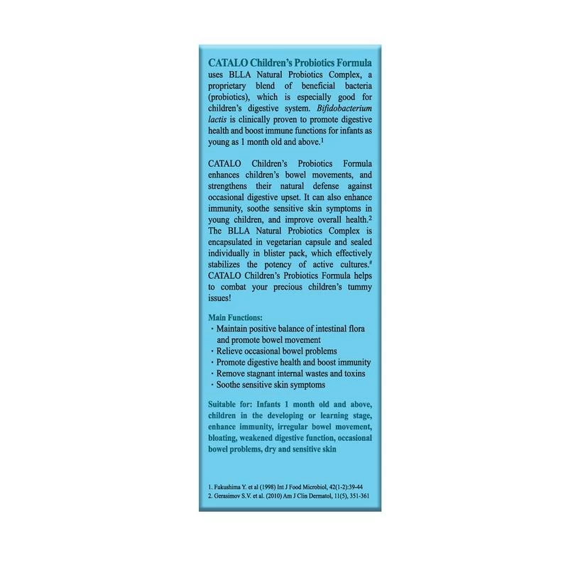 The BLLA Natural Probiotics Complex is encapsulated in vegetarian capsule and sealed individually in blister pack, which effectively stabilizes the potency of active cultures. CATALO Children’s Probiotics Formula helps to combat your precious children’s tummy issues!