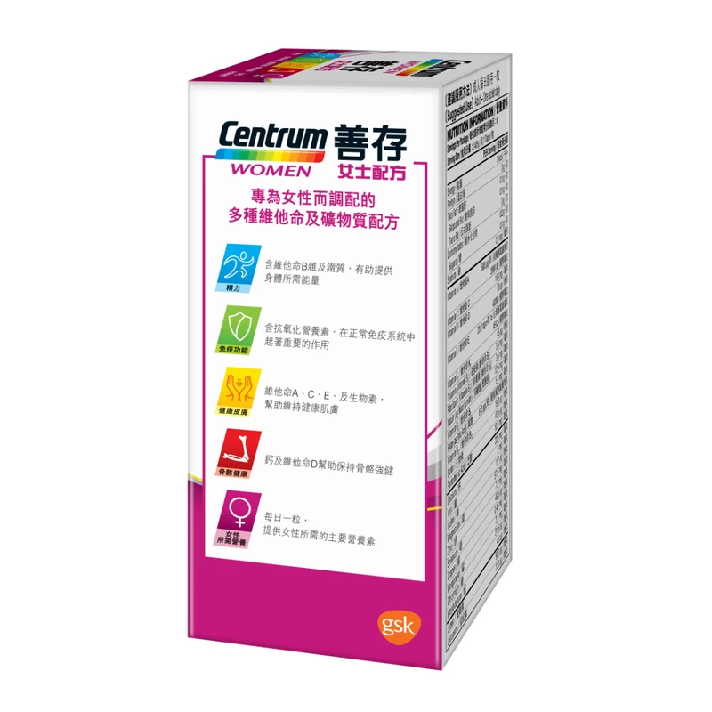 Centrum Women is a multi-vitamin and mineral supplement modified from the formulation of Centrum Advance. It provides the nutrients required by women from A to Zinc to enhance skin health and immunity, allowing you to shine bright and remain beautiful!