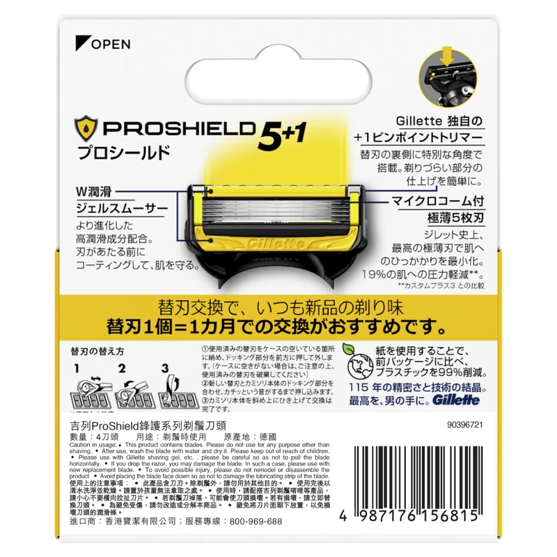 The Gillette ProShield men’s razor with lubrication before and after the blades, shields skin from irritation while you shave for closeness and comfort.
