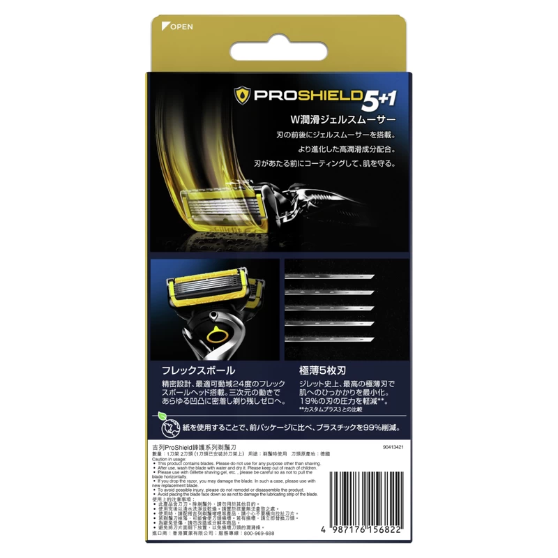 The Gillette ProShield men’s razor with lubrication before and after the blades, shields skin from irritation while you shave for closeness and comfort.
