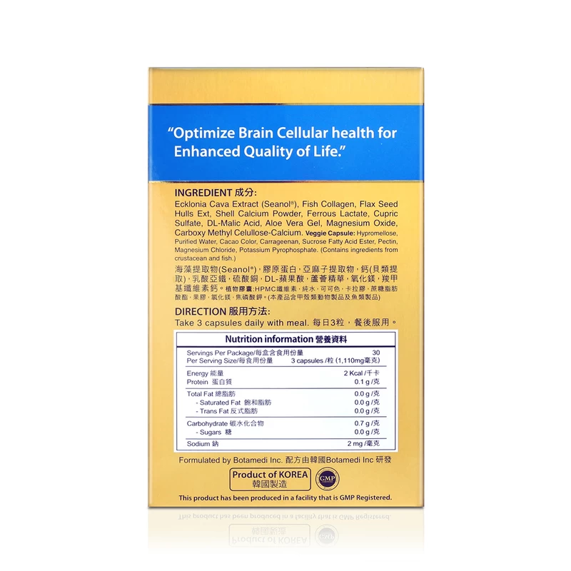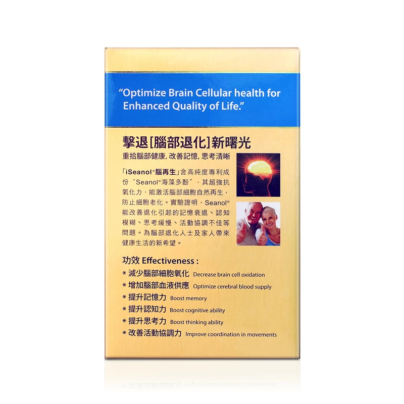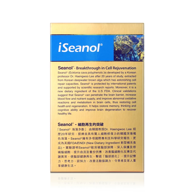 iSeanol® Brain Health Rejuvenation, contains a very high purity of Seanol®, which is protected by international patents and supported by scientific research reports. Moreover, it is a new dietary ingredient of the U.S FDA. Clinical validations suggest that Seanol® can penetrate the brain blood barrier, increase blood flow and nutrient supply, and improve abnormal oxidative reactions and metabolism in brain cells, thus restoring cell health and regeneration. It helps restore memory, thinking and cognitive ability and improve brain degeneration to recover a healthy life.