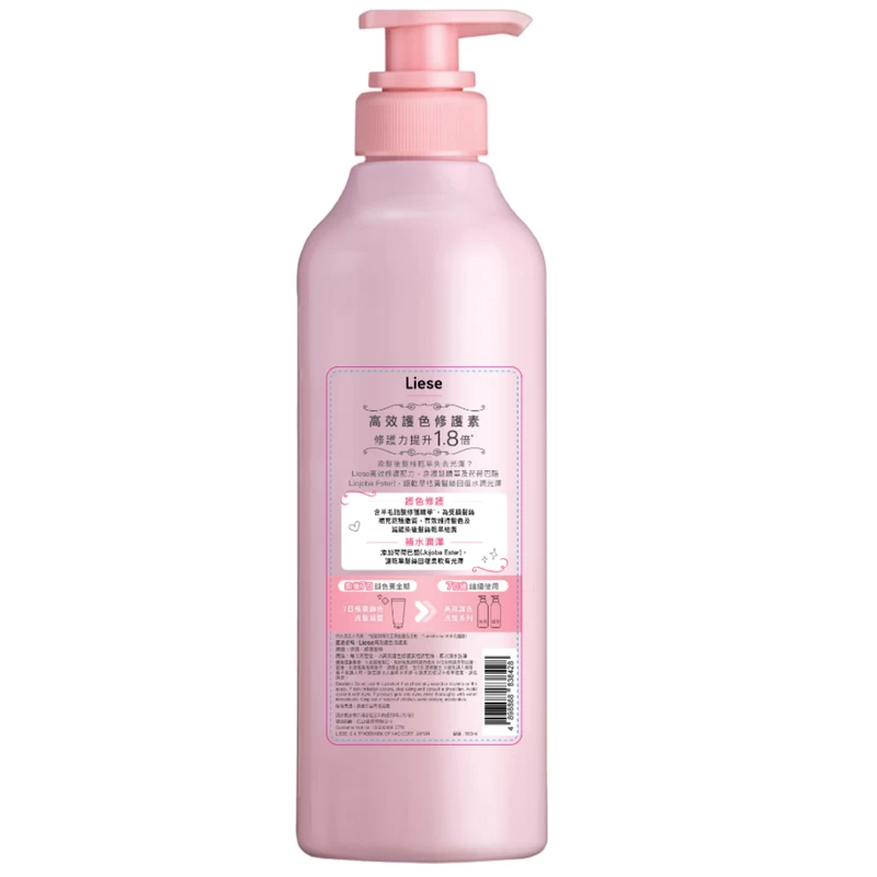 High-efficiency repair formulation, containing Jojoba Ester to restores moisture and luster to dry and dull hair, achieving 1.8* times repairing effect. Lantin Acid is also added , which helps to replenish damaged hair protective lipids, effectively slow down hair dryness and yellowing after dyeing. Use together with Liese Color Lock Shampoo to maximize the colour sustaining effect.