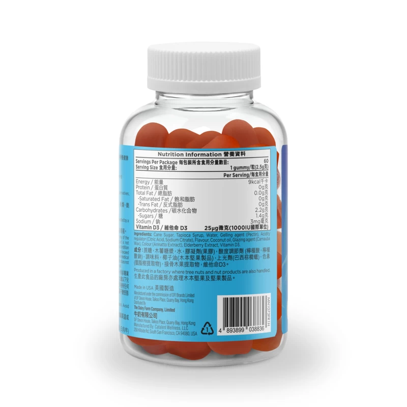 Cane Sugar, Tap oca Syrup, Water, Gelling agent (Pectin). Acidity regulator (Citric Acid, Sodium Citrate), Flavour, Coconut oil, Giazing agent (Carrauba) Wax), Colour (Annatto Extract), Elderberry Extract, Vitamin D3.