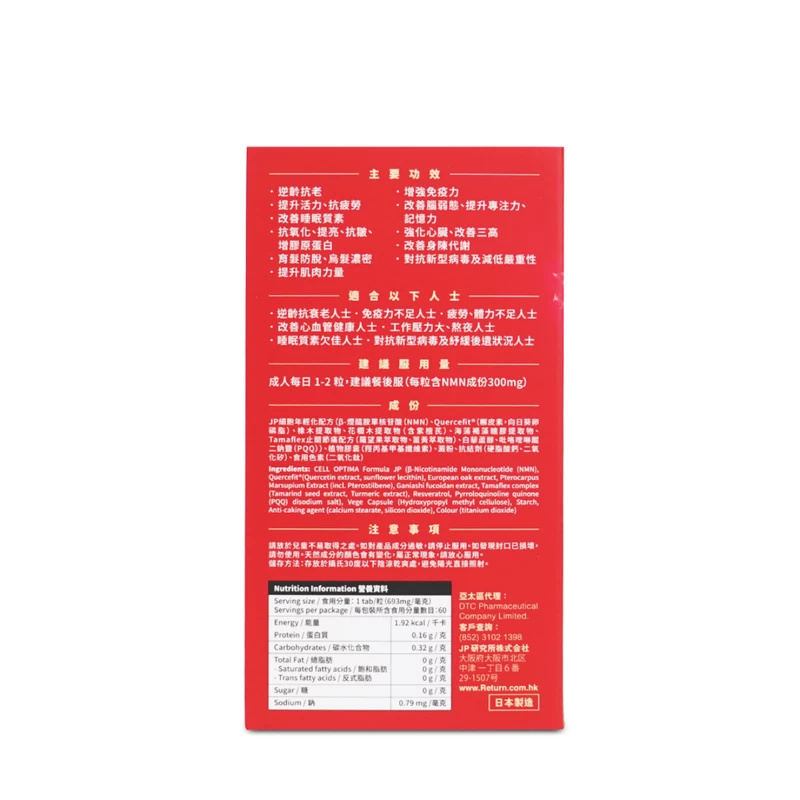 CELL OPTIMA Formula JP (β-Nicotinamide Mononucleotide (NMN), Quercefit (Quercetin Extract, sunflower lecithin), European oak extract, Pterocarpus Marsupium Extract (incl. Pterostilbene), Ganiashi fucoidan extract, Tamaflex complex (Tamarind seed extract, Turmeric extract), Resveratrol, Pyrroloquinoline quinone (PPQ) disodium salt), Vege Capsule (Hydroxypropyl methyl cellulose), Starch, Anti-cakingagent (calcium stearate, silicon dioxide), Colour (titanium dioxide)