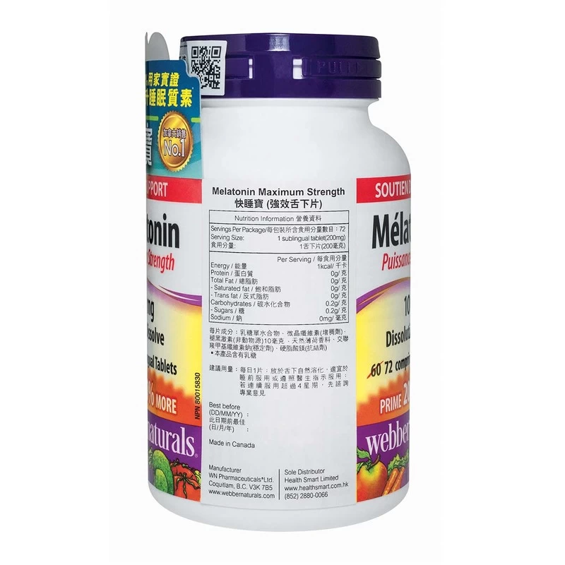 Webber naturals melatonin is Canada’s No.1 melatonin brand#. Each sublingual tablet contains melatonin 10mg which quickly dissolve in 30 seconds*, helps fall asleep quick and easy.