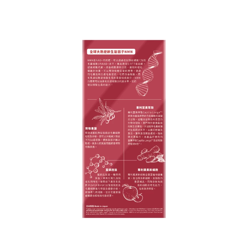 NMN, Capilia Longa™, PhytoCellTec Malus Domestica, Oleanolic acid, Copper Tripeptide, Caffeine, Wasabia Japonica Leaf Extract, Rosmarinus Officinalis Extract, Eriobotrya Japonica Leaf Extract, Oligopeptide etc.
