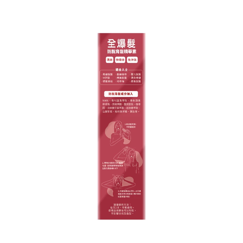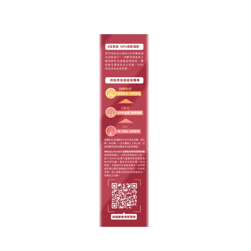 User surveys have shown a significant reduction in hair loss after 6 days of use^. This product contains NMN and patented turmeric extract, which can stimulate shrinking hair follicles, promote the regrowth of capillaries, increase nutrition, and expand shrinking hair follicles. As a result, it can transition hair in the resting phase back to the regeneration phase, leading to the reappearance of hair, preventing hair loss, and stimulating hair regeneration at the same time. The effects may vary from person to person.
