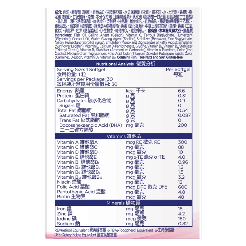 Fish Oil, Gelling Agent (Gelatin), Vitamin C, Ferrous Bisglycinate, Humectant (Glycerine), Coconut Oil, Water, Glazing Agent (Shellac), Stabilizer (Beeswax), Zinc Bisglycinate, Niacin, Humectant (Sorbitol Syrup), Emulsifier (Mono- and Diglycerides of Fatty Acids), Emulsifier (Sunflower Lecithin), Vitamin E, Calcium D-Pantothenate, Glycine, Vitamin B6, Vitamin B2, Stablizer (Triethyl Citrate), Vitamin B1, Stabilizer (Ammonium Carbonate), Vitamin A Palmitate, Color (Iron Oxides), Medium Chain Triglycerides, Folic Acid, Color (Titanium Dioxide), Potassium Iodide, Color (Carmine), D-Biotin, Vitamin D3, Vitamin B12. Contains Fish, Tree Nuts and Soy. Gluten-free